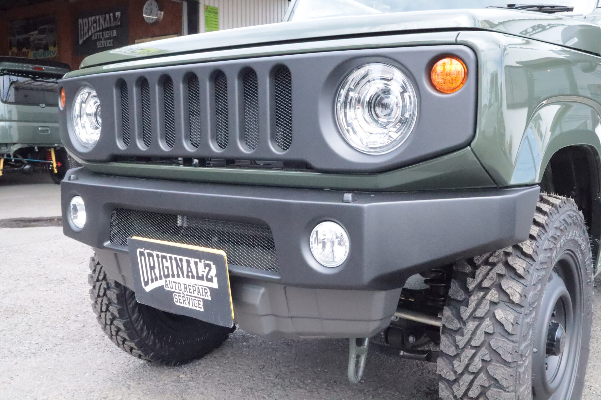 スチール(鉄)製のグリルをラプター塗装し、2色塗分けしたタクティカルバンパーでフロントをコーディネート。