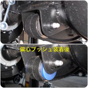 フロントリーディングアームのブッシュを、プレス機にて抜き取り偏心ブッシュを圧入します!